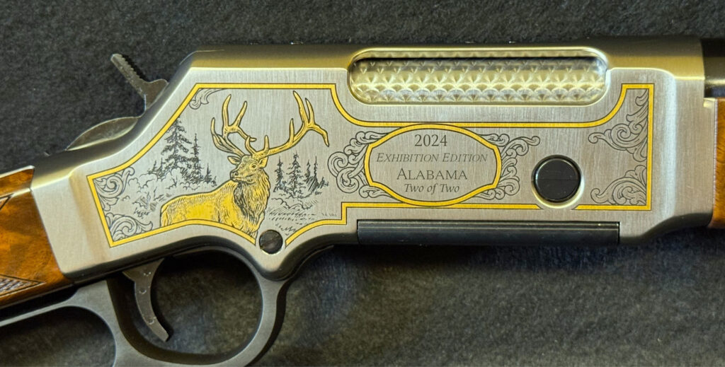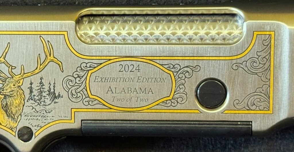 Centered under the ejection port and the eye-catching jeweled bolt on this rifle is the “2024 Exhibition Edition, name of state, “Two of Two” inscription, highlighted by scroll engraving.